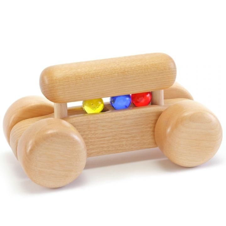 木の温かみがいっぱいのバスには4色のビー玉が乗車中。動かすとビー玉がカチカチと心地よい音をさせます。 上下に開いている穴を使えばビー玉を隠したり、順番を入れ替えたりと変化を楽しめます。 程よい重みとどっしりとした作りなので、ハイハイからしっかり立てるまでの間の時期でもお子様の体重をしっかり支えてくれます。グッド・トイ2016受賞