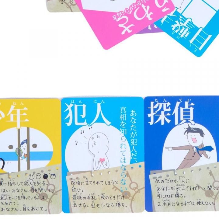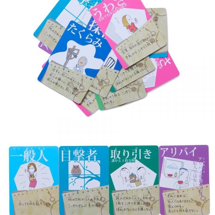 みんなでわいわいカードを渡しながら、「なるほどなるほど、むふふふ」「えー、またこのカードかぁー」などと情報を集めていき、〈犯人〉を持っているのを当てられてしまうドキドキや、予想外のハプニングで貴重な手札が巡るドラマが盛り上がる、子供から大人まで手軽に遊べるおすすめのゲームです。