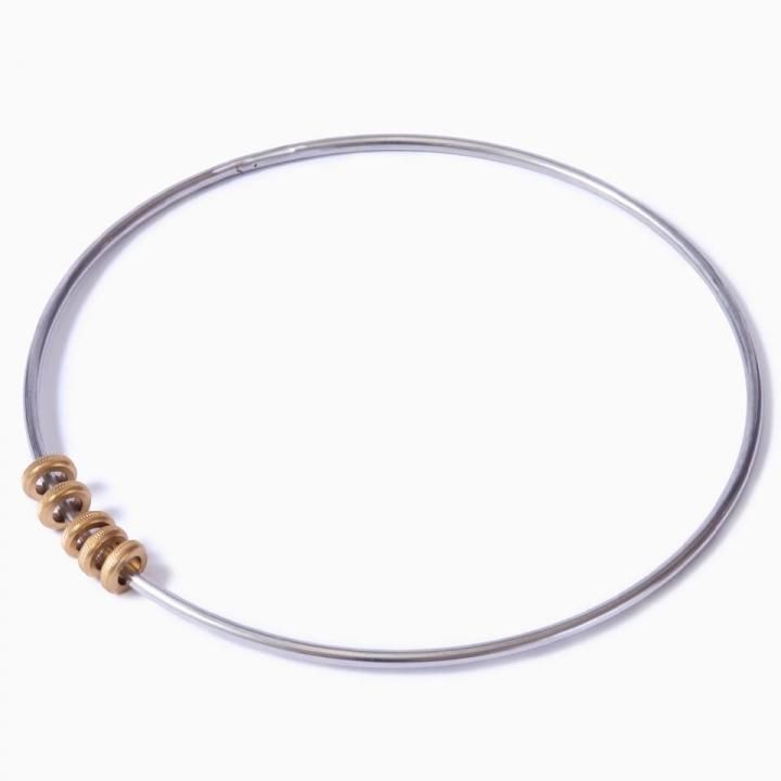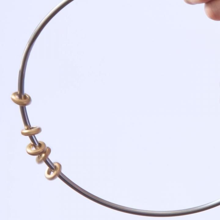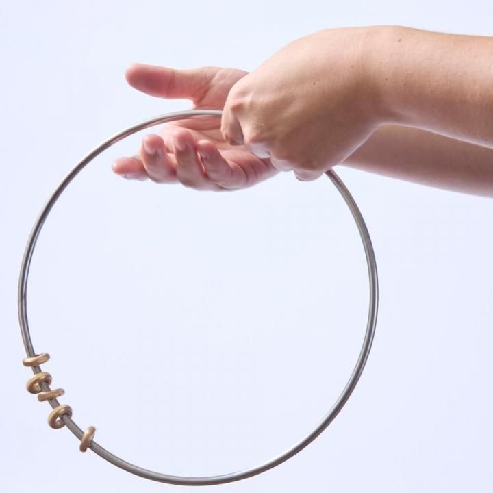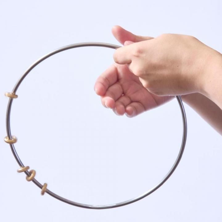 直径25cm程の金属のリングに真鍮製の小さなビースが付いていて、リングを回すとビースが音を立てて小刻みに揺れながら回転します。その回転音や手に伝わる振動が心地良く、ビーズの回転を維持するための微妙な力加減や集中力が求められるおもちゃです。