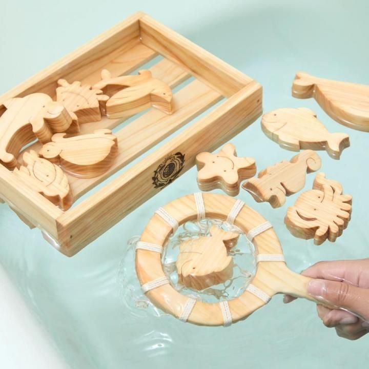 海の生きものたちをぷかぷかと浮かべたり、網や木箱ですくったり、積んでみたりと様々な遊びがお風呂で楽しめます。