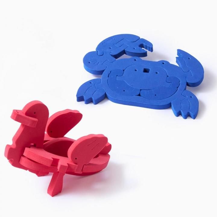 平面から立体、立体から平面へと組み替えて遊べるお風呂用パズル玩具です。 壁に貼ったり湯船に浮かべたりと、年齢に合わせた遊び方ができ、お風呂で親子のコミュニケーションが生まれます。 他種類との組み合わせで多彩なモチーフをつくることもでき、組立の難易度が上がることで、成長に応じた想像力や発想を引き出しながら長く楽しめます。