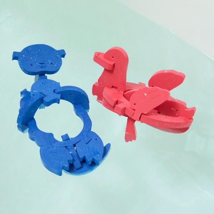 平面⇔立体にかたちを組み替えられ、そのまま湯船に浮かべてお風呂で遊べる特許取得済みのパズル玩具。