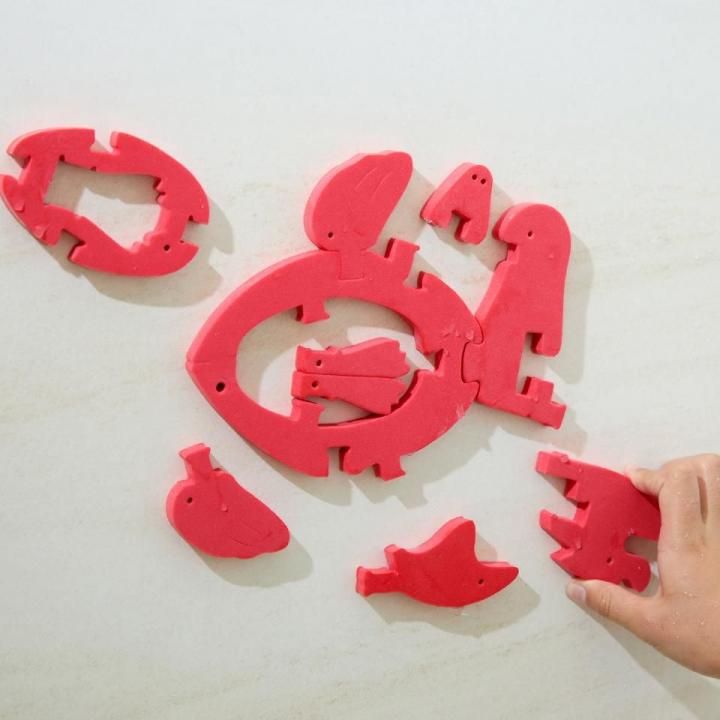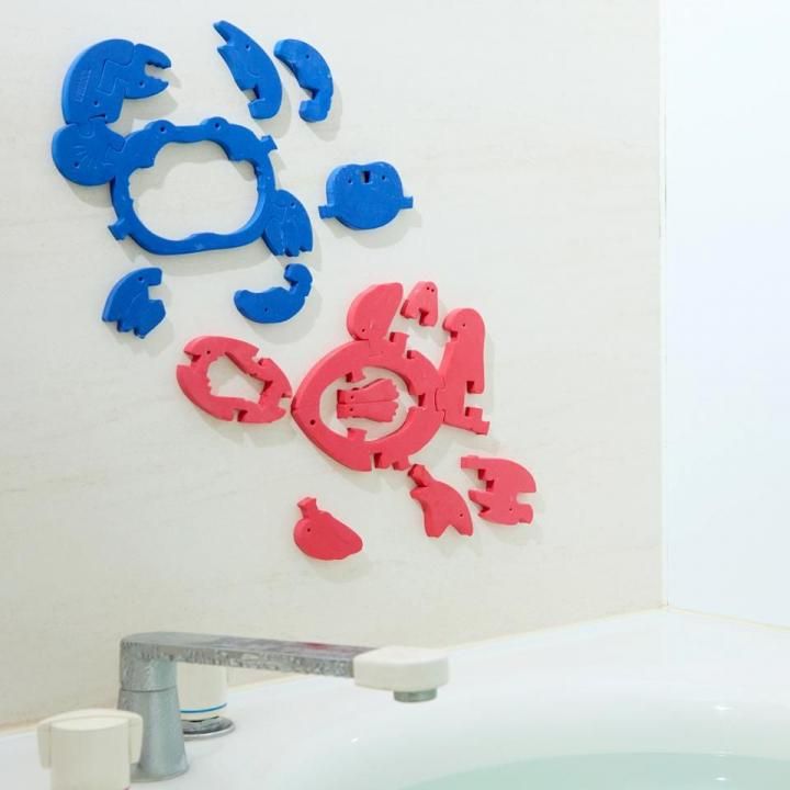 お風呂の壁に貼る、組み立てて湯船に浮かべる、お風呂が親子の絶好のコミュニケーションの場に。付属の組み立てシートの答え以外にも他種類との組み合わせ等で様々なモチーフを作ることが出来るので子供の自由な想像力を引き出します。