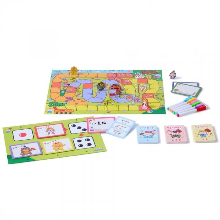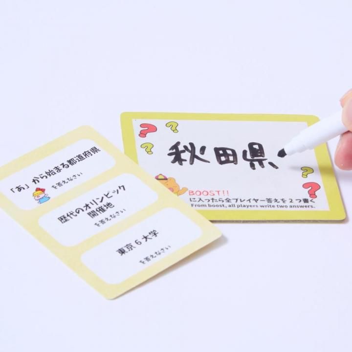 クイズは簡単なものから難しいものまで難易度が選べます。ただクイズに答えて正解なら進めるわけではありません。クイズはどれも回答がたくさんある多答クイズです。回答は1人ずつ発表していき、すでに発表されている回答と同じ答えを書いてしまうと進めません!代わりに先に発表していた人が1マス進むことができます。ハラハラする新しいすごろくゲームをお楽しみください。