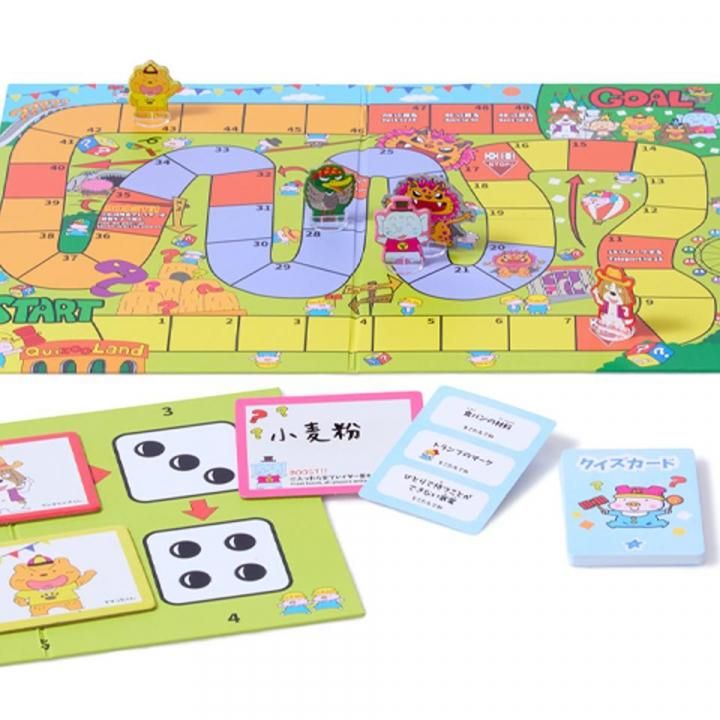 クイズに答えた順に進めるマス数を選べる、サイコロを使わないすごろくです。答えがかぶると進めなかったりするので、何を答えようか考えるのが楽しいです。